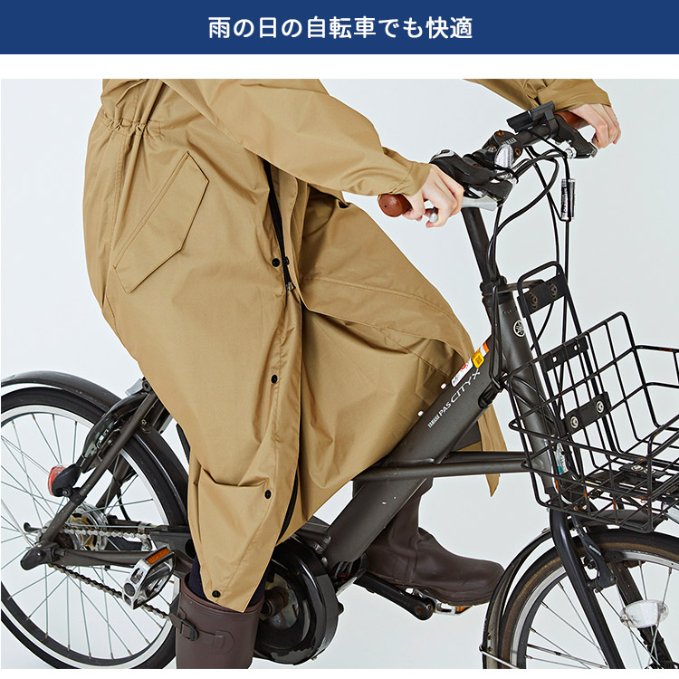 中にリュックやショルダーバッグなどを背負っていてもそのまま着用可能。また、自転車に巻き込まれることのないように設計されています。