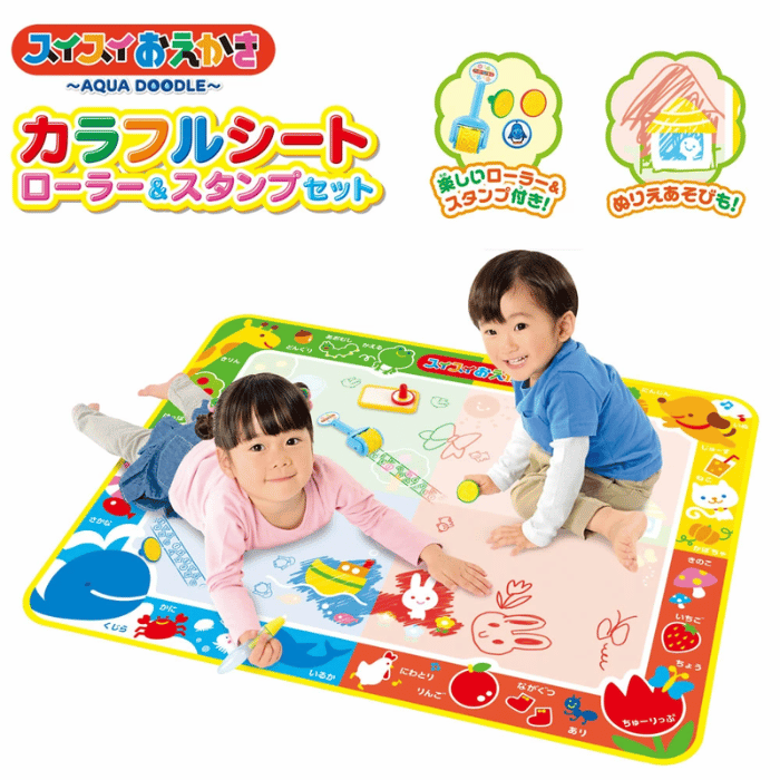 水で描いて30分ほど経つと自然に消える、くり返し遊べるお絵描きシートセットです。