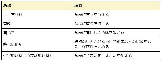 おかしに含まれることが多い添加物と役割を以下の表にまとめました。