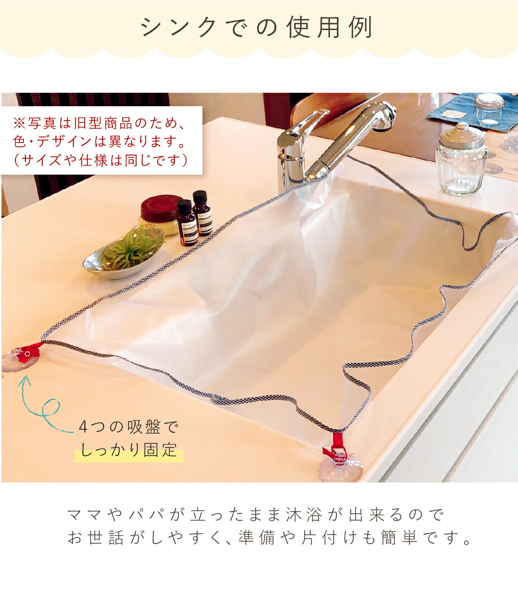 シートタイプのベビーバスです。シンクや洗面台にシートの四隅を吸盤で貼り付けて使用します。0.2mmの適度な厚さで汚れや水分もカンタンに拭き取れます。使用後は清潔にして水を切り、物干し竿に干して乾燥させるだけでOK。シートタイプなので収納にも困りません。安心安全の日本製で、生後6か月まで使用できます。