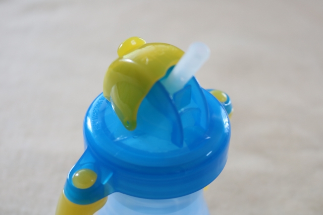 ストロータイプの赤ちゃん用マグは、ストローが出ている状態でひっくり返しても漏れにくい構造になっています。