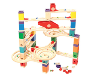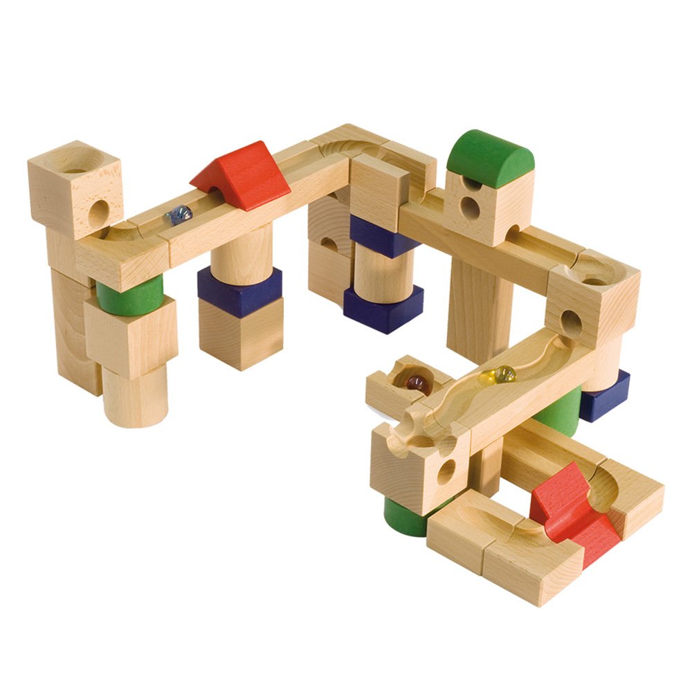 パーツにくぼみがあり、ビー玉を転がせられるタイプの積み木です。