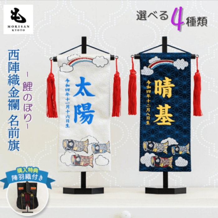 京都の老舗が手がける、西陣織の生地を使った名入れ名前旗です。