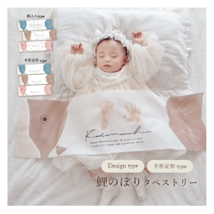 手形や足形を残せるデザインもある、こいのぼり型のタペストリーです。