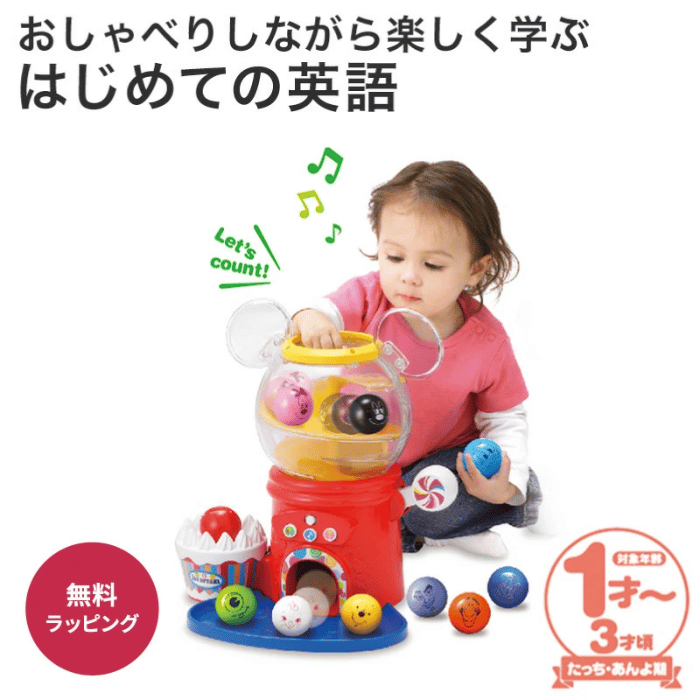 英語・数・色や、いろいろなおしゃべり・音楽を楽しめる、ガチャマシーン型の知育トイです。
