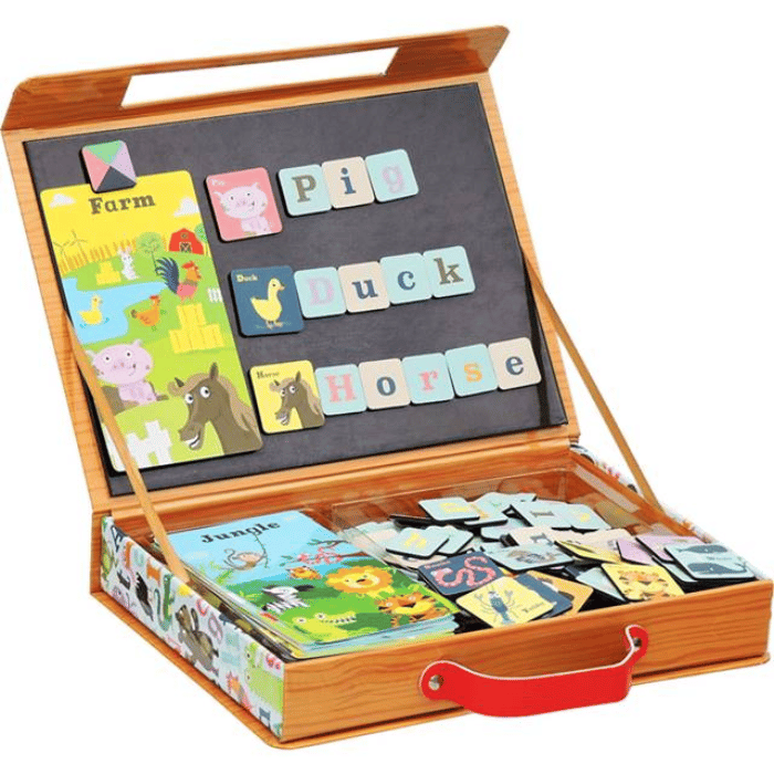 アルファベットの磁石のシートを使って動物の名前をつくるときの、ペタペタと貼る感触が楽しいアイテム。
