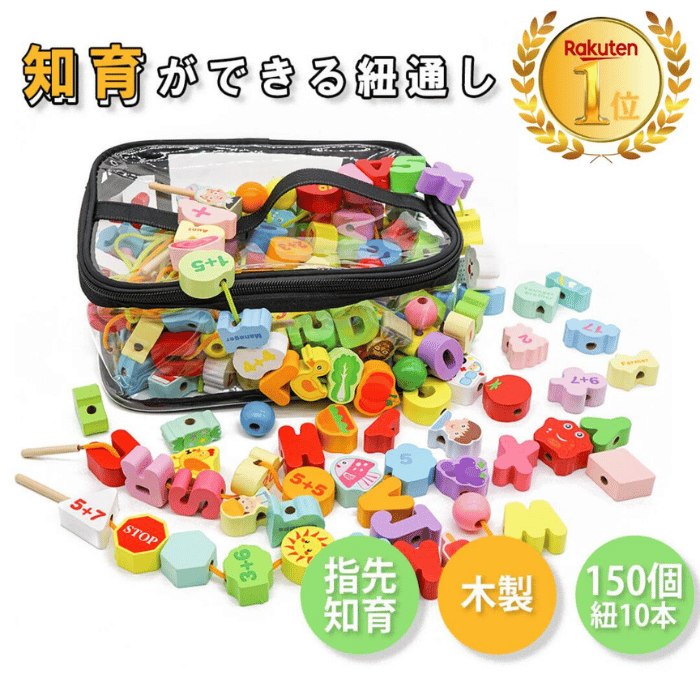 アルファベットだけでなく、動物や食べ物など、150個ものブロックがあり、飽きずに楽しめる紐通しおもちゃです。