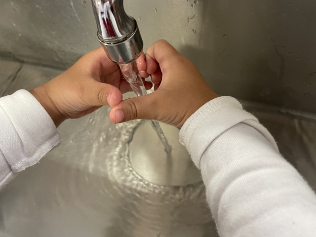 感染症の予防には手洗いとマスクの適切な使用の習慣が大切です。子供たちに手洗いの習慣を身につけさせ、指と指の間の消毒を行います。