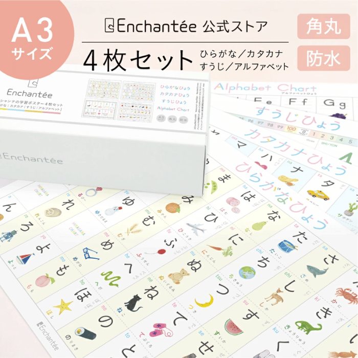 ひらがな、カタカナ、すうじ、アルファベットの4種類のポスターセットで、長く学べます。