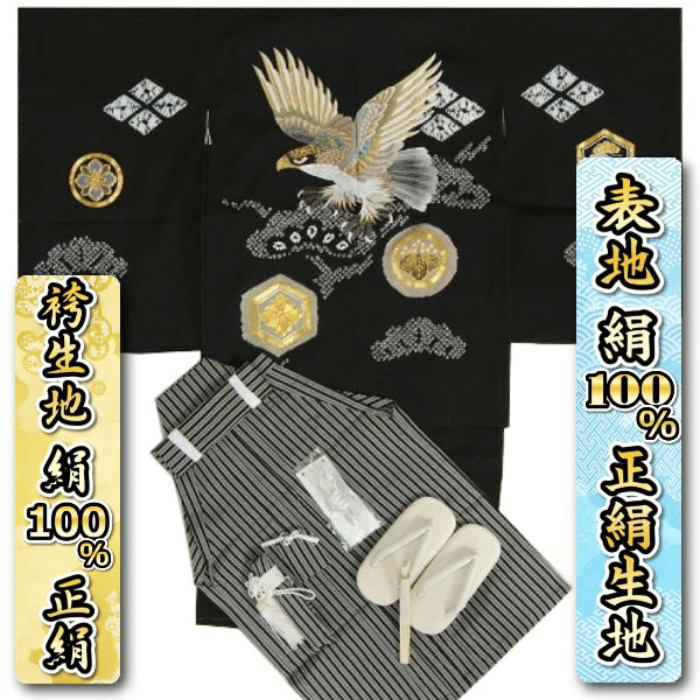 豪華な総刺繍の鷹が目を引く、正絹の羽織着物袴セットです。
