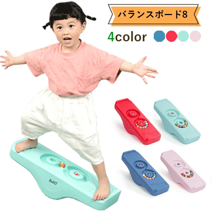 バランスボードに乗りながら、真ん中のボールを8の字に動かすことで、バランス感覚や体幹を鍛えられます。