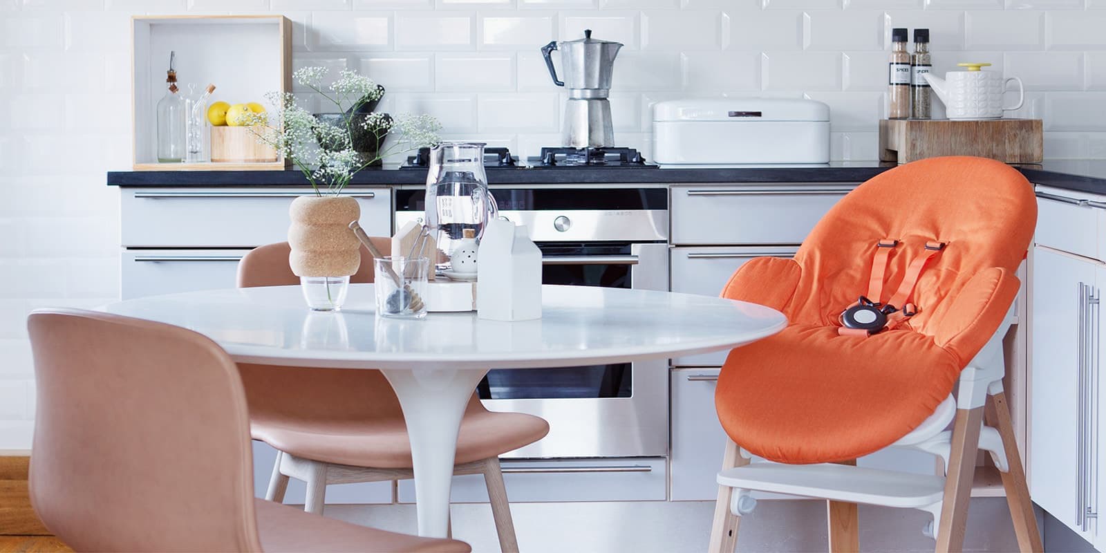 別売りになりますがストッケのステップスチェアに取り付けることで、ダイニングテーブルにいるママやパパの目線と同じ高さになります。